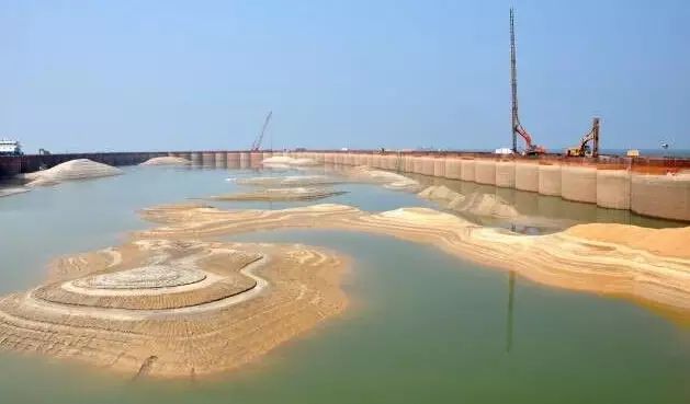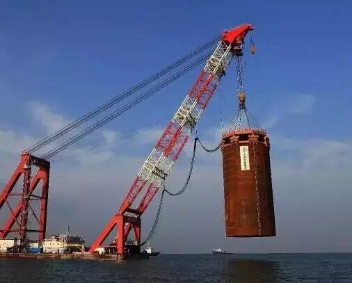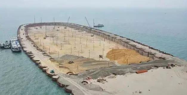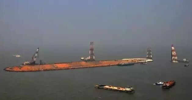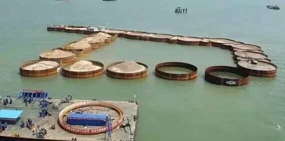 ▼巨型钢筒串成人工岛的框架