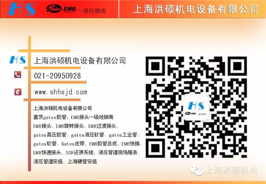上海洪硕机电设备有限公司(Gates.EMB 一级经销商)主营范围包括: 进口液压管路连接件、测试仪器仪表、管路安装用设备的销售,液压管路连接技术服务等。