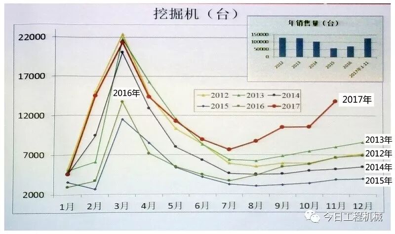 根据中国工程机械工业协会挖掘机械分会行业统计数据,2018年1月纳入统计的25家主机制造企业,共计销售各类挖掘机械产品10687台,同比涨幅135.0%。其中,国内市场销量(统计范畴不含港澳台)9547台,同比涨幅141.9%。出口销量1137台,同比涨幅89.5%。
