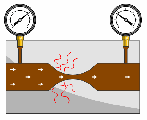 有一点需要说明,当流体经过节流口时,由于摩擦等损失的存在,会导致节流口前后存在压力差。也就是说当流体经过节流口时,存在能量损失。当流体经过节流断面时,流速是最大的,即流速的增加伴随着节流断面处压力的大大降低。当流体流过节流断面之后,扩展进入更大的区域,速度下降,压力增加。但下游压力不会完全恢复到上游的压力(对比前后两个压力表的读数),这是由于较大内部紊流       和能量消耗的结果。