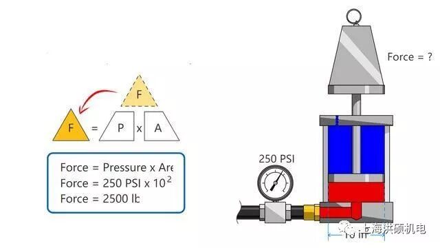 下面我们就来看看如何应用这个FPA三角形。如果我们知道了系统压力P和液压缸活塞的面积A,那么我们就可以求出系统所传递的力F的大小。如图17所示,知道了系统压力P=250psi,活塞面积A=10in2,就可算出力F的大小为2500lbf(lbf表示英制单位,磅力)。