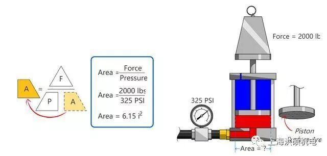 如果我们知道了系统压力P和系统所传递的力F的大小,那么我们就可以求出活塞面积A的大小。如图18所示,知道了系统压力P=325psi,力F=2000lbf(lbf表示英制单位,磅力),就可算出活塞面积A的大小为6.15in2。