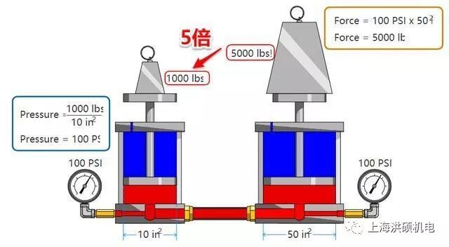 6、力的放大作用如图20所示,在左侧液压缸的小活塞底部施加一个较小的力,那么右侧液压缸就可以获得一个较大的举升力。从图中可知,该力被放大了5倍之多。