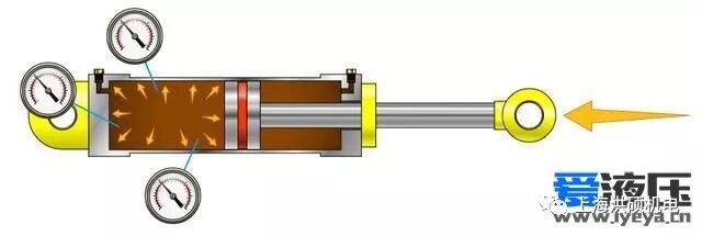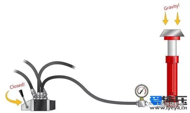 静态压力是表示当流体想要运动时却受到了限制,不能发生流动。如图11所示,重物受重力的作用,将活塞杆向下压。但是由于前端的控制阀处于关闭状态,使得活塞杆无法下落。因此,被困在液压缸无杆腔中的油液获得重物的势能,获得的能量我们可以通过压力表以压力的形式中度量出来。