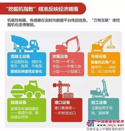 【挖掘机说:路桥建设回暖,核电、风电等新能源引擎启动】2015年前11个月的“挖掘机指数”显示,起重机、履带吊的施工时长和开机率降幅收窄。起重机应用广泛,而履带吊是风能和核电设备施工装配的重要机械。摊铺机和压路机,同比去年都有一定增长,显示路桥建设回暖。统计数据也佐证了挖掘机的“判断”:2015年1-11月份,全国固定资产投资(不含农户)497182亿元。其中,道路运输业投资增长17.5%。